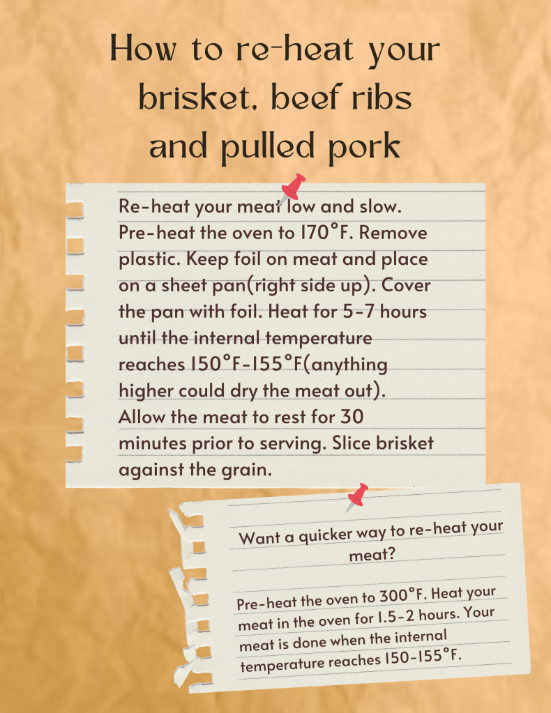 Read on for instructions on reheating your brisket, beef ribs, pulled pork, pork ribs and turkey. If you have any questions feel free to reach out via instagram or send us an email.